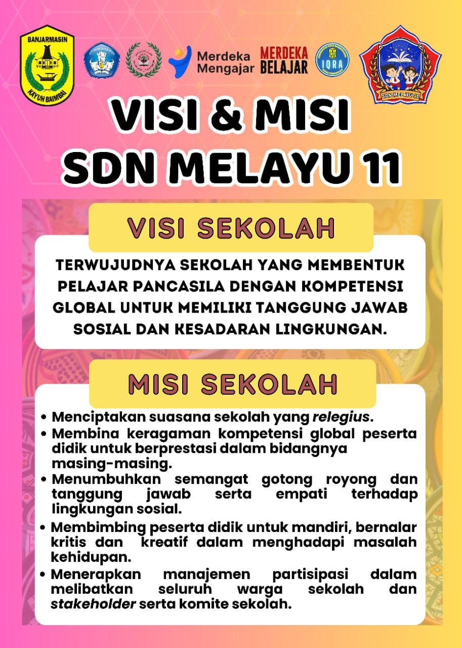 Judul Utama: "VISI & MISI SDN MELAYU 11" menggunakan huruf kapital besar, jelas, dan mudah dibaca.